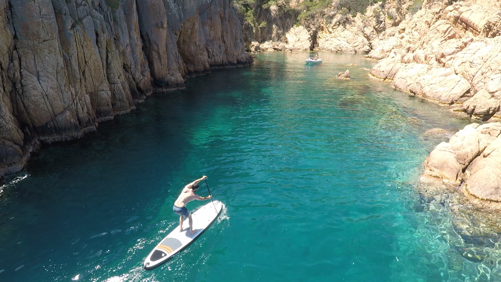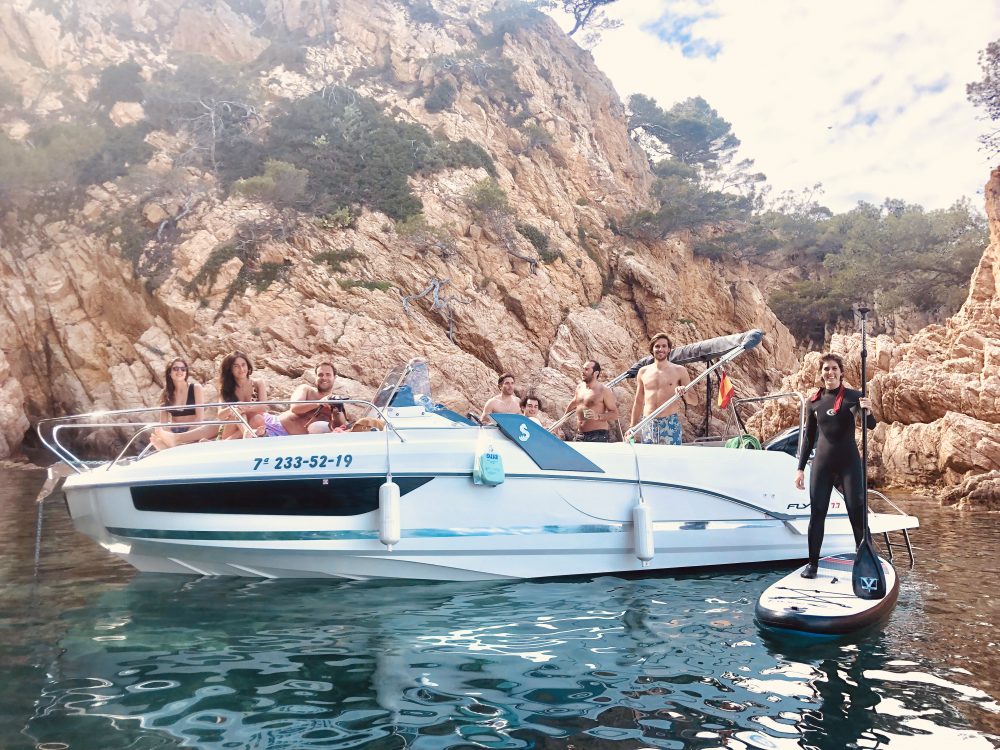 We will part from the port of Port d’Aro and we will sail towards S’Agaró – Sant Feliu. Anchored in the most authentic caves with crystal clear waters we will swim and snorkel to see the marine life. We also will ride with our Paddel Surf to discover all the little amazing corners, caves with indoor beaches, rocky areas and exotic landscapes. During anchoring, you can wether relax on the boat with a drink and enjoy lying in the sun or under the awning reading a book. You can combine adventure and relax, depending on what you want, there is a plan for all tastes and ages! Then we will have an aperitif and we will refresh ourselves to go sailing to the next cove, where we will eat and we will be able to continue with the activities or relax.